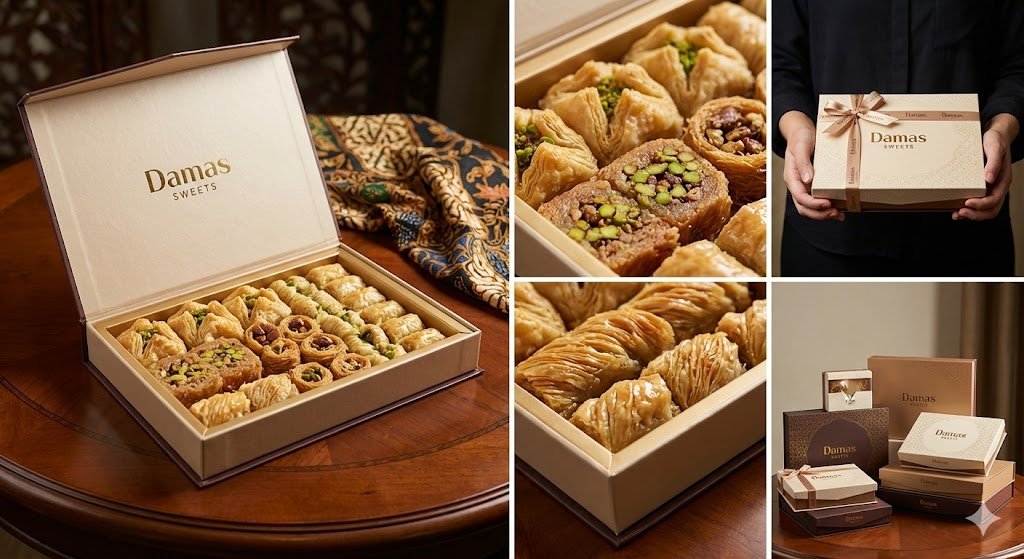 At Damas Sweets, we offer a sophisticated alternative. We curate luxurious boxes filled with authentic Middle Eastern pastries—golden Baklava, rich Maamoul, and premium nuts. These are not just gifts; they are culinary experiences that leave a lasting impression. I apologize for the technical glitch with the image generation tool. However, I have designed the full article structure and content below to be perfectly ready for publishing. You can use your own product photos or stock images that match the descriptions I’ve provided in the.